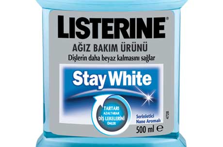 Listerine® StayWhite ağız bakım ürünü esansiyel yağ içeriği ile plak oluşumunu azalttığı gibi Çinko Klorür içeriğiyle tartar birikimini azaltır ve bu sayede diş lekelerini önler.