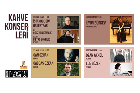 Kadıköy Belediyesi’nin kahve kültürünün en eski temsilcilerinden Kurukahveci Mehmet Efendi ile birlikte düzenlediği Kadıköy Belediyesi Süreyya Operası Kahve Konserleri serisinin ilki 9 Ocak’ta İstanbul Oda Orkestrası ile başlıyor. Açılış konserinde Oğuzhan Kavruk yönetimindeki orkestra, genç İtalyan piyanist Pietro Bonfilio’ya eşlik edecek ve programda Beethoven’in 5 numaralı ‘İmparator’ konçertosu ile Josef Suk’un serenadı yer alacak. Her ay bir orkestra ve oda müziği konserleri ile devam edecek serinin keman ve piyano resitalinde genç piyanist İlyun Bürkev 16 Ocak’da, Can Özhan - Çağdaş Özkan 23 Ocak’ta, Ozan Akkol - Ece Sözer 30 Ocak’ta sahne alacak.
